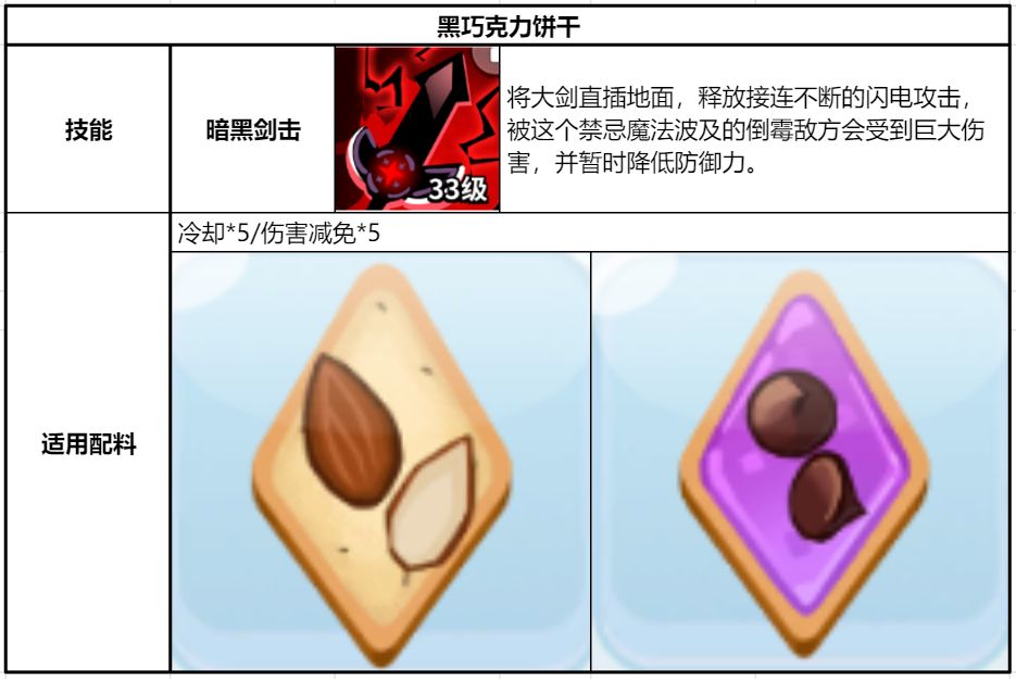 能降低对手防御里的饼干,这个效果不管是PVE还是PVP都很适用。黑巧克力饼干的技能是群攻,在降低对手防御力的时间内,也可以变向理解是己方输出饼干造成的输出持续增加。但是,在自动状态下,黑巧克力饼干的这种造成对手debuff的技能最好预设先释放。