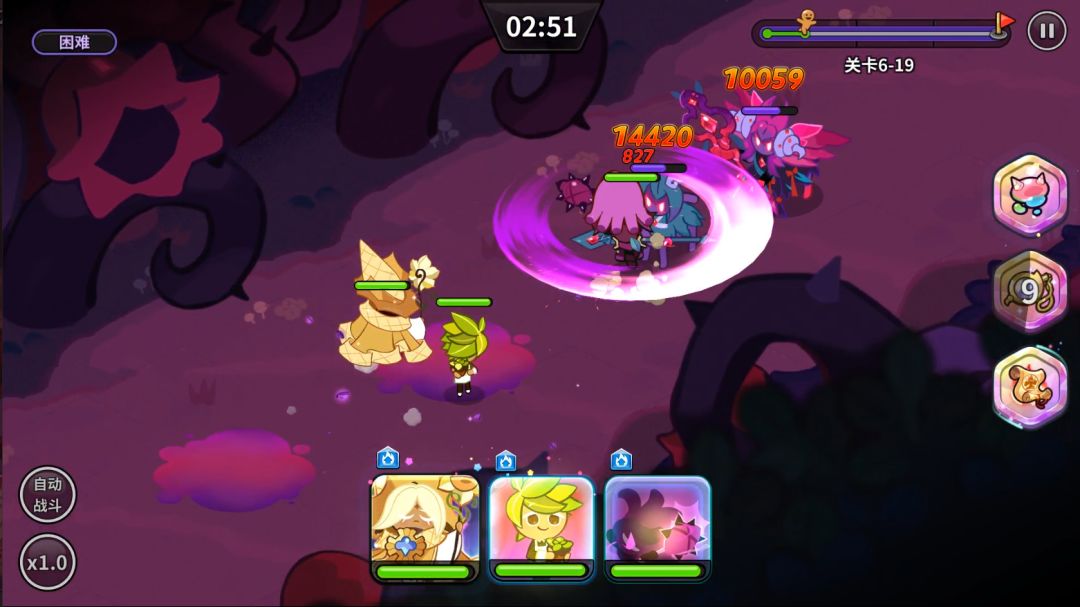 技能是抡起棒槌猛转对手,差不多能转8圈,同时攻击的对手越多伤害越高。因为转敌人的时候紫薯饼干不容易被打断,而且可以转到对手后排,所以作为一个可以扰乱对手技能释放的饼干,紫薯饼干既可以打PVE,也能打PVP。