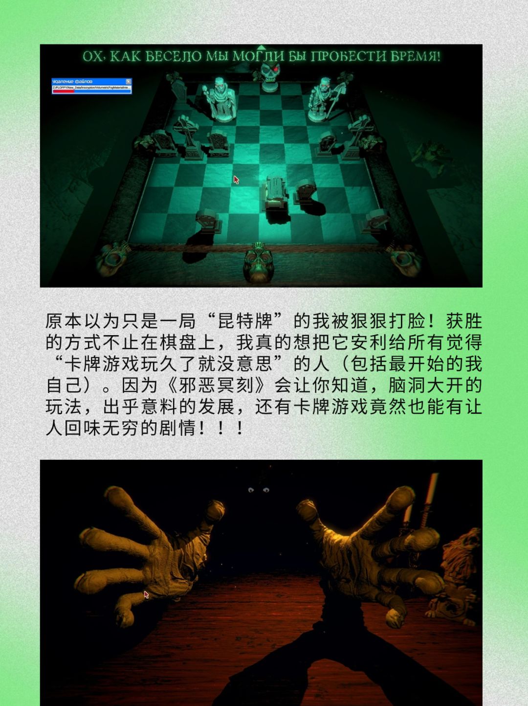 总之,这是 一款除肉鸽卡牌+解谜+密室逃脱外,在剧情上也非常优秀的恐怖解谜游戏。(我玩完之后津津有味看了无数个解析视频),尤其在尾声部分,游戏深刻探讨了网络与现实的交互问题,你真的会在某个游戏的片段不寒而栗。游戏真的不只是"游戏"。