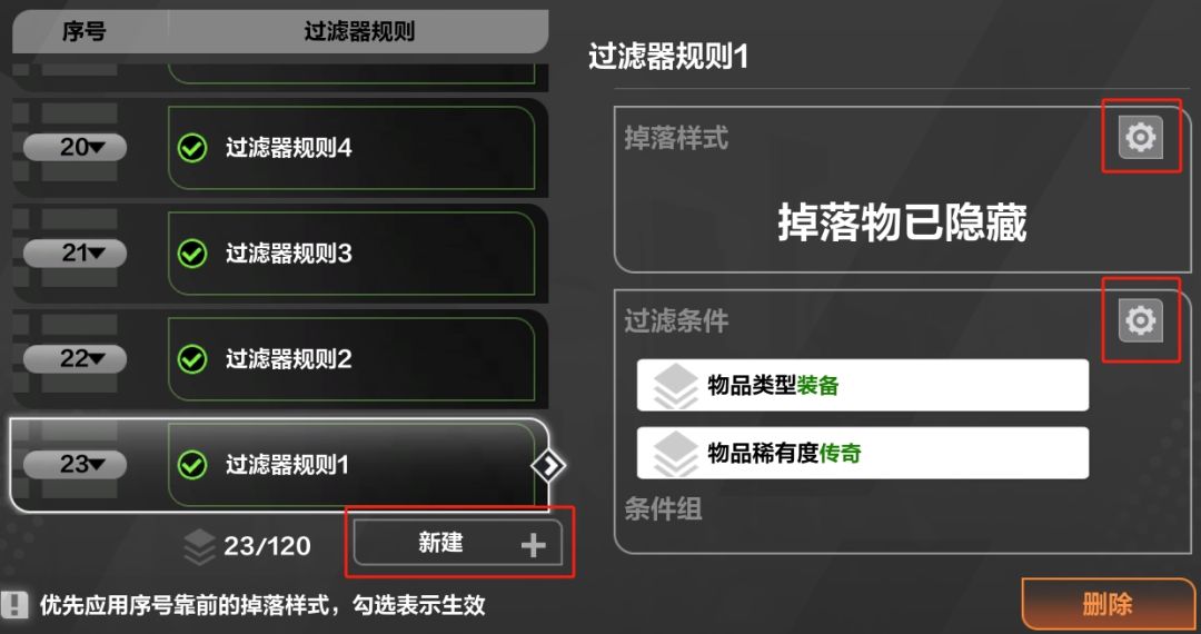2.新建一条规则后,点击右侧的两个“齿轮”齿轮分别设置掉落样式与过滤条件及条件组。