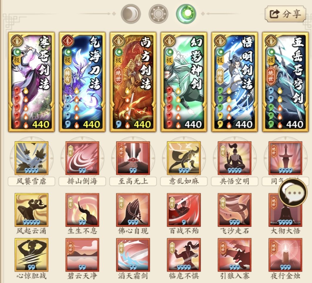 因为周年什么东西都没嫖到,只能先把独臂将军的部分招式融入我之前dot调和剑套路了,(有刺乌的把气海上碧云换刺乌,有移形换影也可换掉碧云)这套融入了尚方剑法让五岳暴击率更大的提升,武学伤害也有所增加,五岳会变的更暴力,但是把曼陀换了之后飞沙的易损一般只有二回合了(除非碧云触发),所以这套飞沙最好还是换凤鸾,因为前手位幻影带了百战不殆,灼烧伤害增加,额外一个灼烧,加上圣火灼烧,尚方灼烧,如果凤鸾再一个灼烧,就是四个灼烧,凤鸾的实战减伤和百战的灼烧伤害增加,会让对面烧的欲仙欲死![[表情_斜眼笑]](https://img-tc.tapimg.com/market/images/d1b1dcc88719f6c9a639728cde152c4b.png)