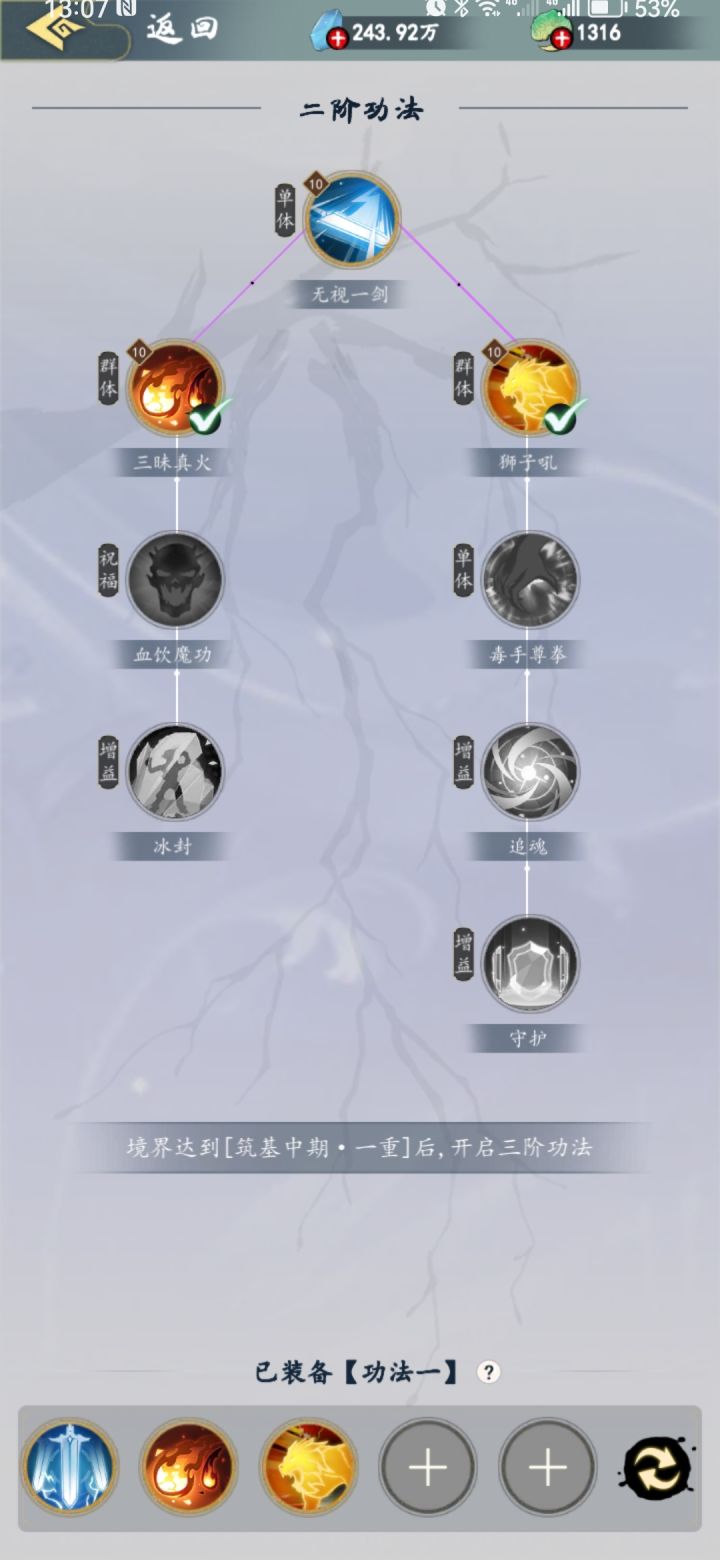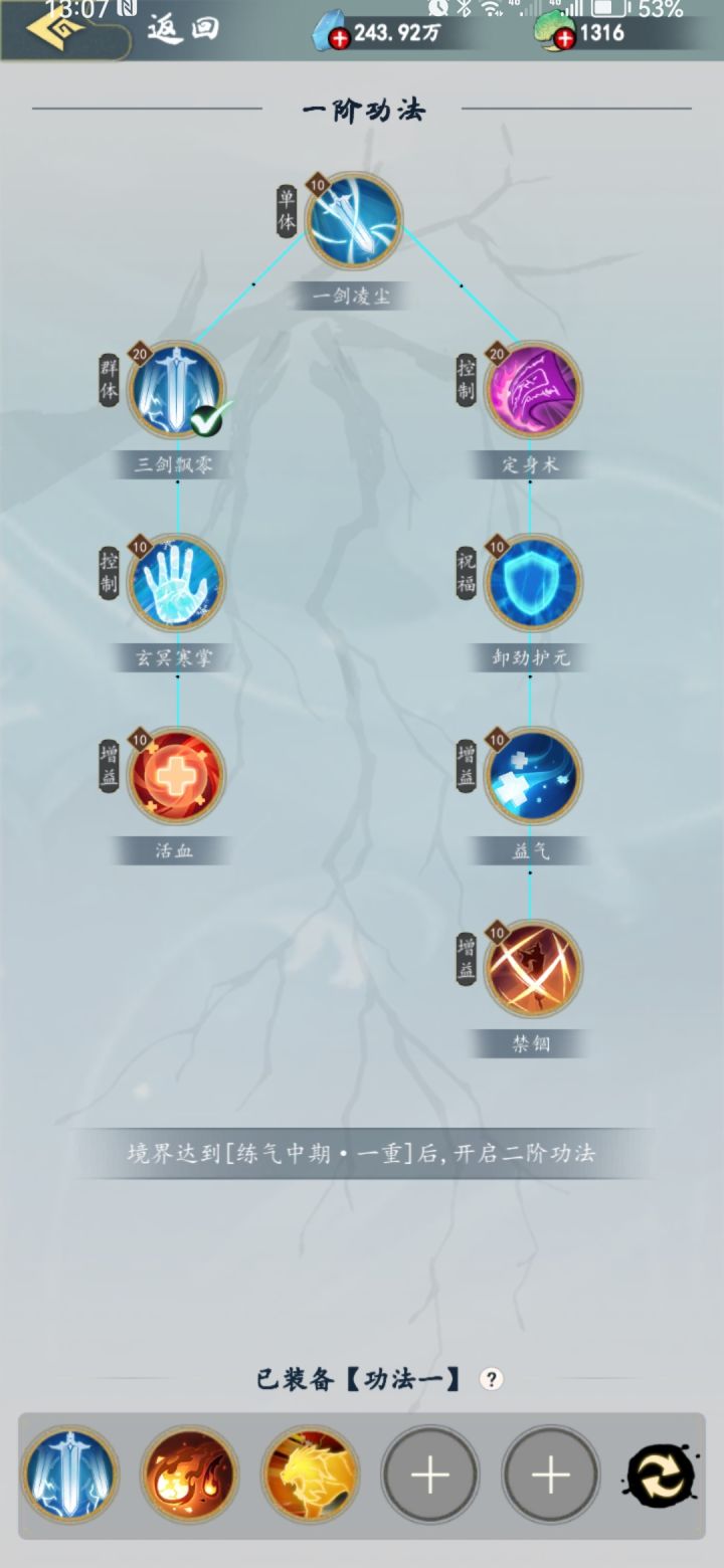 功法是游戏的特色系统,学习需要境界和前置功法等级需求,消耗残页进行升级。总共有三阶功法,每阶有八个,每十级需要突破才能继续升级,突破消耗功法总纲,这个很珍贵,只有灵玉商店和无尽深渊出,所以商店刷到一定要买。游戏第一天一阶功法全部学到10级,然后把三剑和定身突破,学到20级,接着学第二阶的功法,功法至少都得学到10级,但是突破需要总纲,所以要慎重突破,避免浪费总纲,总纲不足就去打无尽深渊,或者看看每小时刷新的商店。