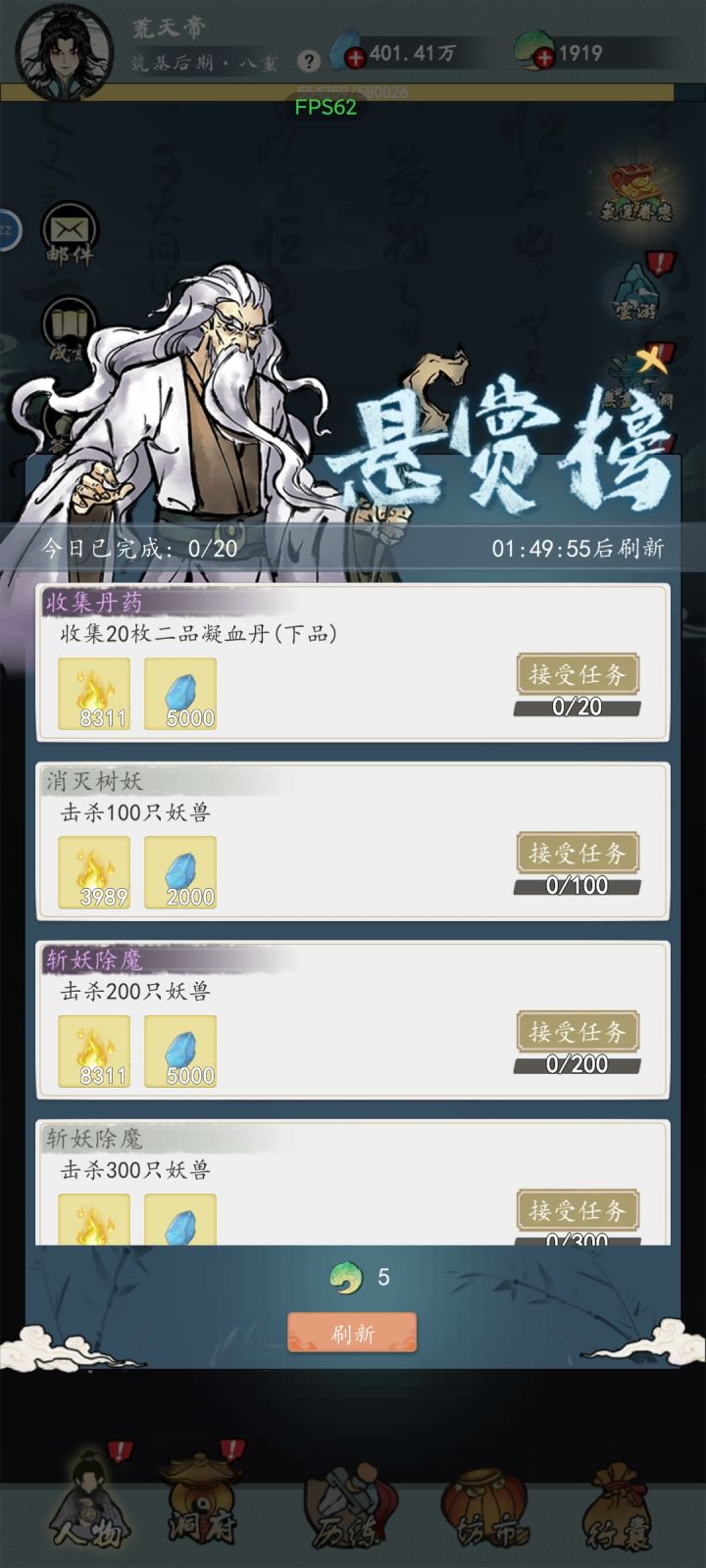 任务主要就两种,一个是杀一定数量的怪,一个是要不同等级的丹药,在药房炼制即可。