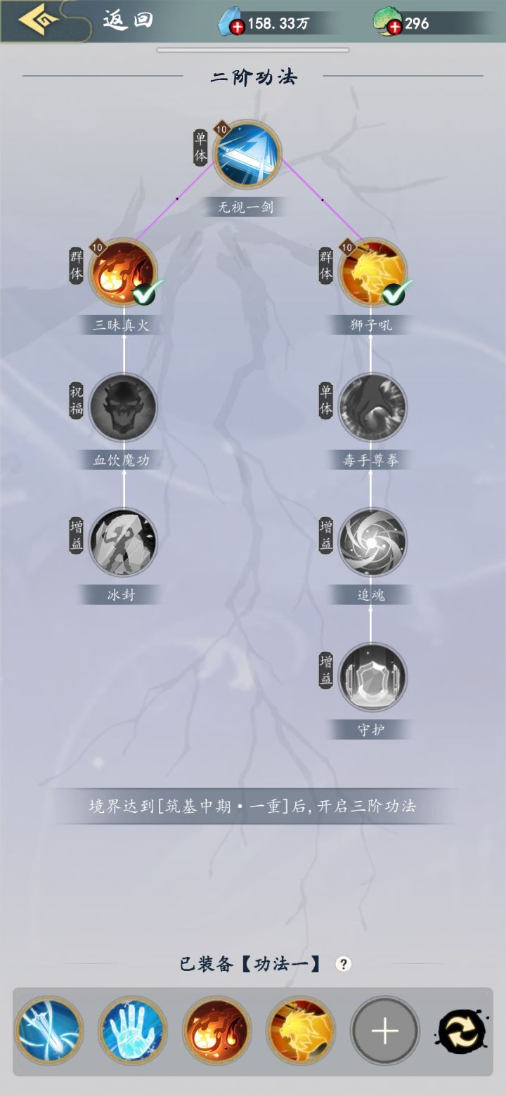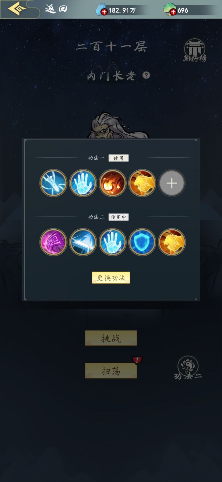 2:功法总共有两套方案,历练(主线)是默认方案一。点击人物,功法,右下角有个旋转按键可以切换。方案二的用途主要是打深渊之类,点开深渊,点击下方的功法里头有小字使用哪一套可以进行切换。