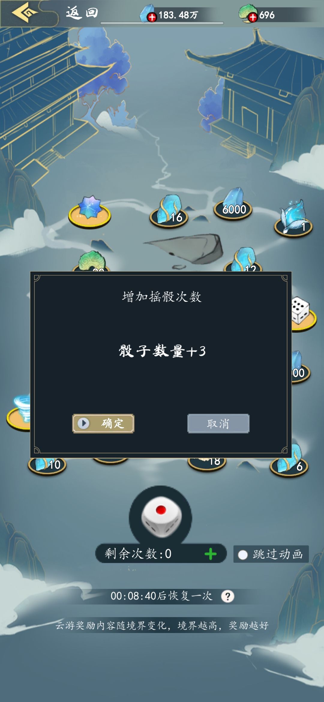 3:云游的骰子会每12分钟自动回复1点,自动回复上限10点,所以骰子不要存超过10个(成就可以不领存着),每过一个大境界云游奖励会有提升,能存就存一点。最后骰子点+号,可以看广告领几次不要忘了![[表情_酷]](https://img.tapimg.com/market/images/edd50e702f508971043f5619f686740e.png)