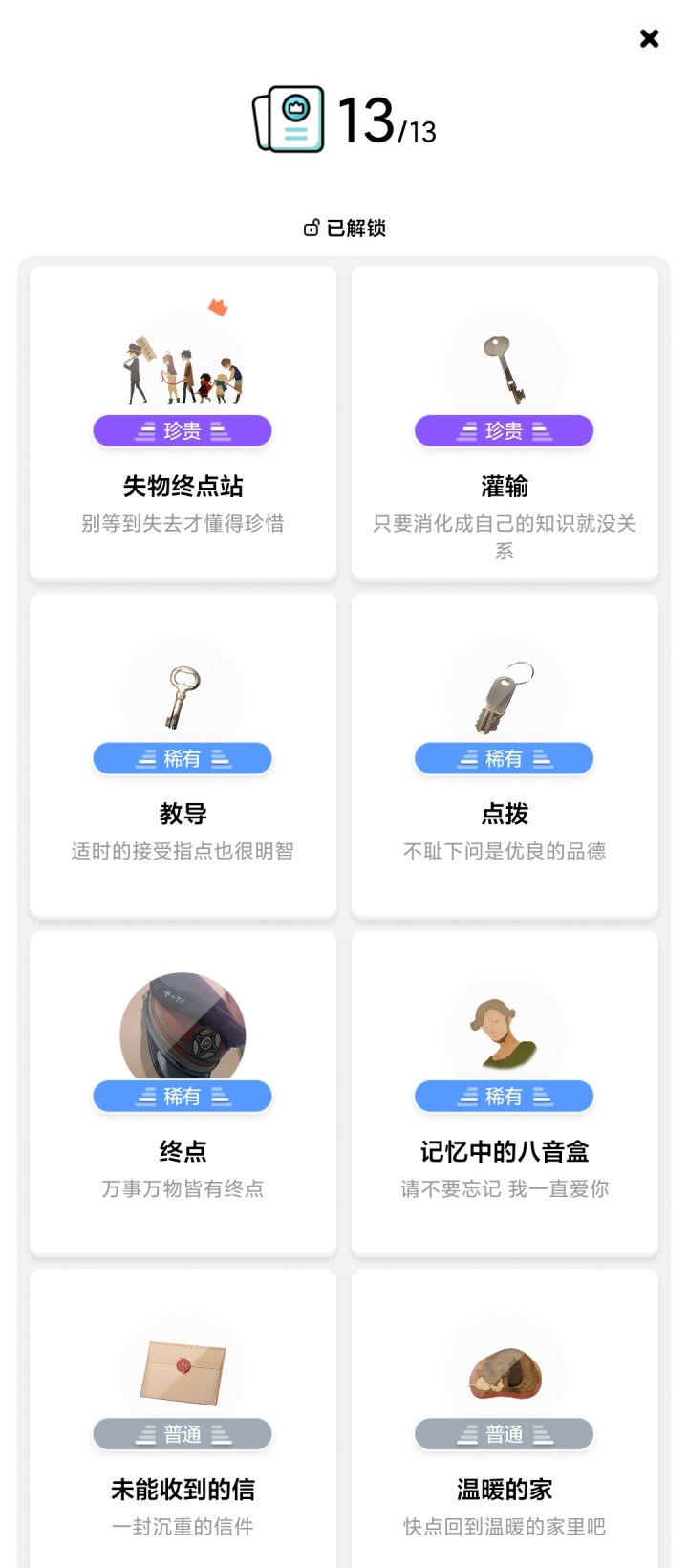 有九个是过剧情过关解锁,三个(灌输,教导,点拨)是需要看广告,我一共看了大概十几个广告,没细数,最后一个(失物终点站)是总成就,也就是说其他十二个全部解锁了最后一个也就达成了