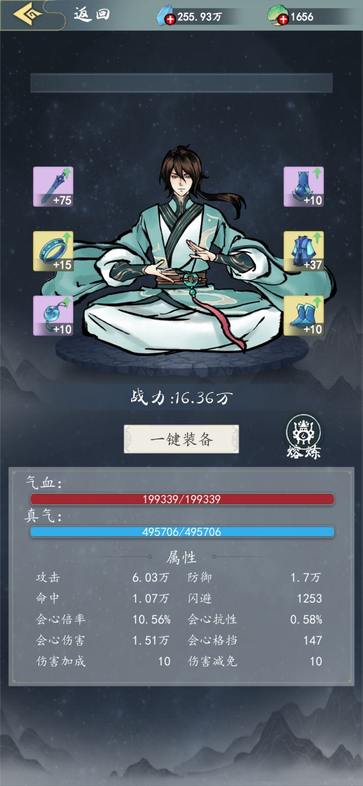 装备:点开装备,里面有你的武器和各种属性介绍,点击你的装备会显示更换和培养,前期得到的练魂石可以盯着一个主武器升级来提高自己的攻击力,方便推塔和刷图,更换的话地图活着商城刷新出的材料和突破可以在洞府里面打造,打造的品级看运气,白色最低黄色最高,炼气期没必要追求装备,到了筑基可以进行换装备,材料不需要着急地图挂机都会有。