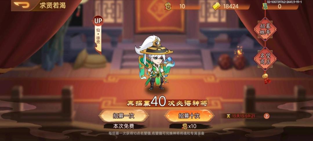 活动内容:活动期间,可通过消耗招募令进行招募武将,up武将的概率会高于其他同档位武将(每期活动会更换up武将),每次招募可获得10名望,名望可在名望商店兑换道具;