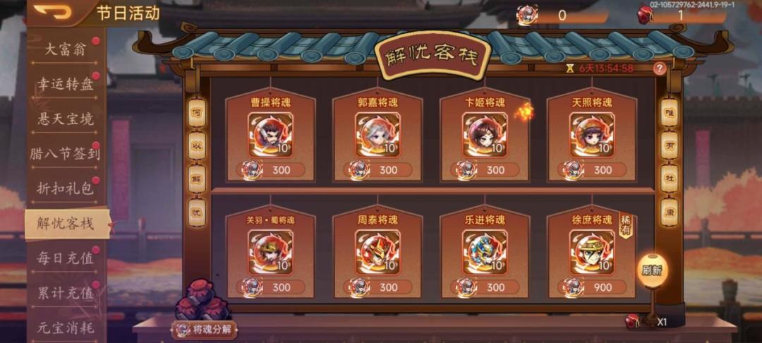 活动内容:活动期间,可通过【武将之魂】兑换将魂,可通过【解忧酒】刷新客栈的将魂,每天有一次免费刷新次数