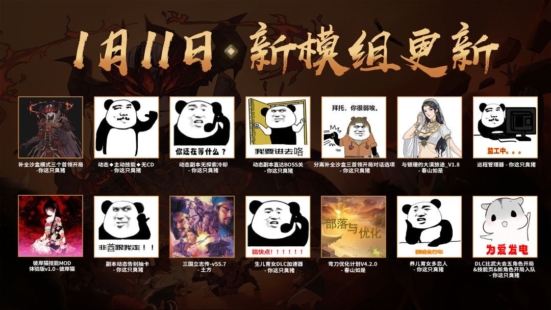 在上次的更新中,我们有提到在更新之余也和MOD作者们共同推进MOD搬运工作,今天为大家带来的是8个新的MOD作品,以及之前部分MOD作品的更新内容汇总