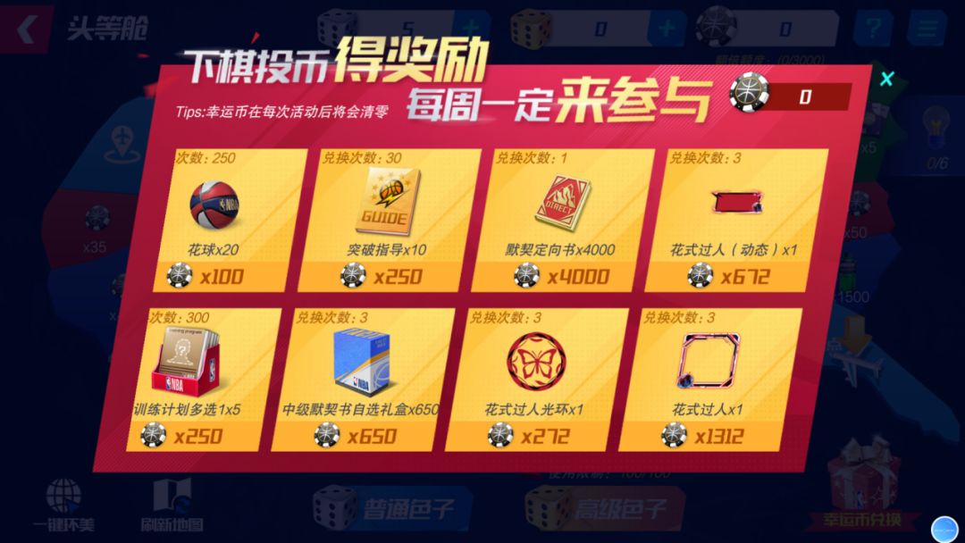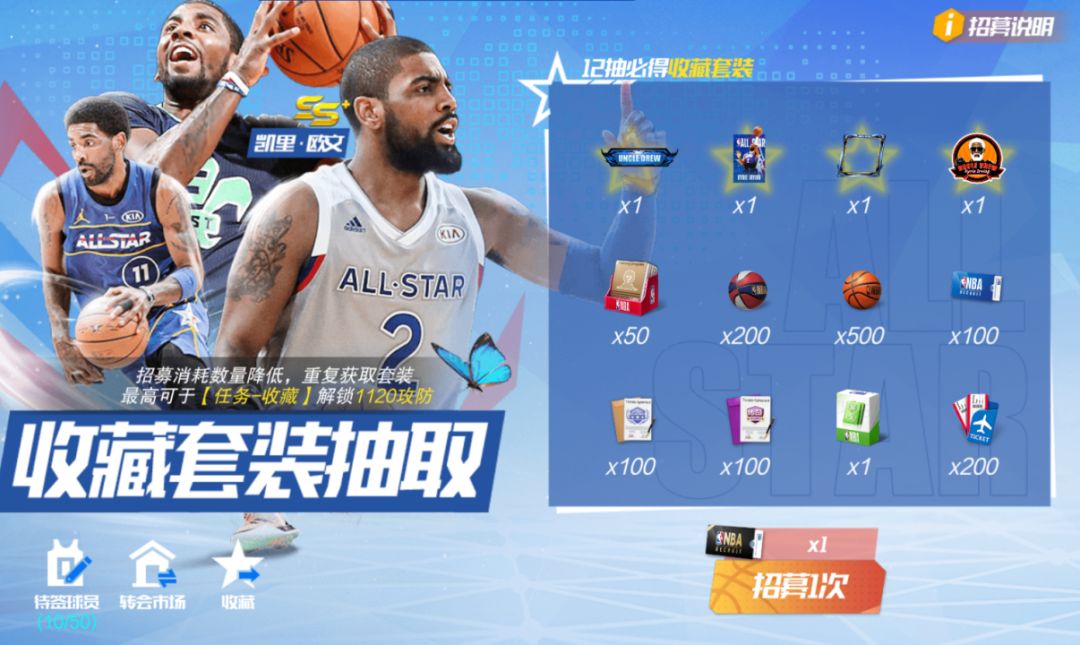 每次“抽一次”,则随机解锁一个奖励格,获取奖励格中的“全明星球员”或“转会费”。至多抽取12次,成功将全明星队欧文签约入队!