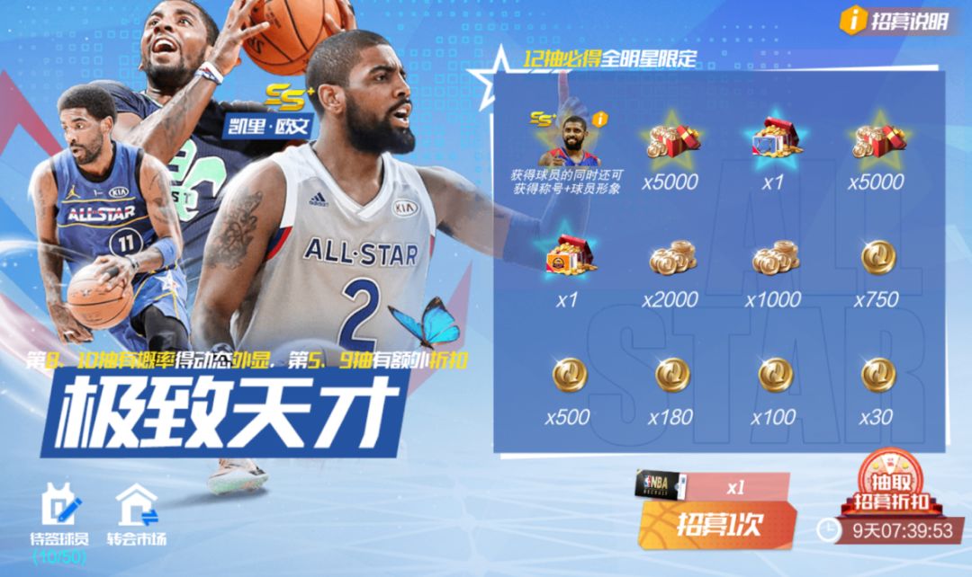 新增幸运转盘折扣! 活动期间,可使用【精准招募函】在【精准招募-极致天才】池中,招募全明星队欧文。