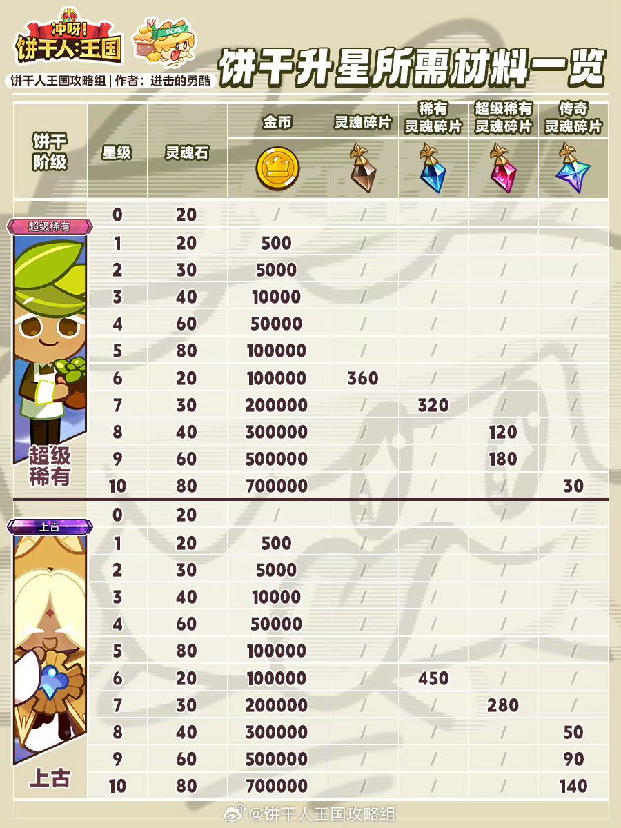 饼干升星所需要的材料一览,所有阶级饼干升星需要的碎片和金币是一样的,但是不同阶级的饼干在超越升星时消耗的灵魂碎片会有所不同~(上古饼干超越时需要消耗大量传奇灵魂碎片~)