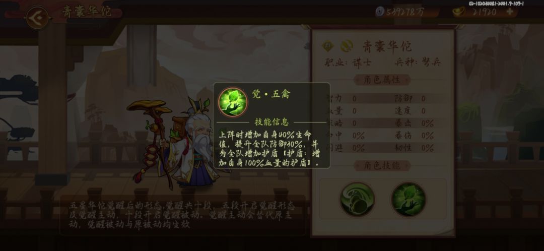十觉被动:增加自身40%生命,全体30%防御,并为全队增加护盾(一次性,不可清除),护盾量为华佗生命值系数100%。