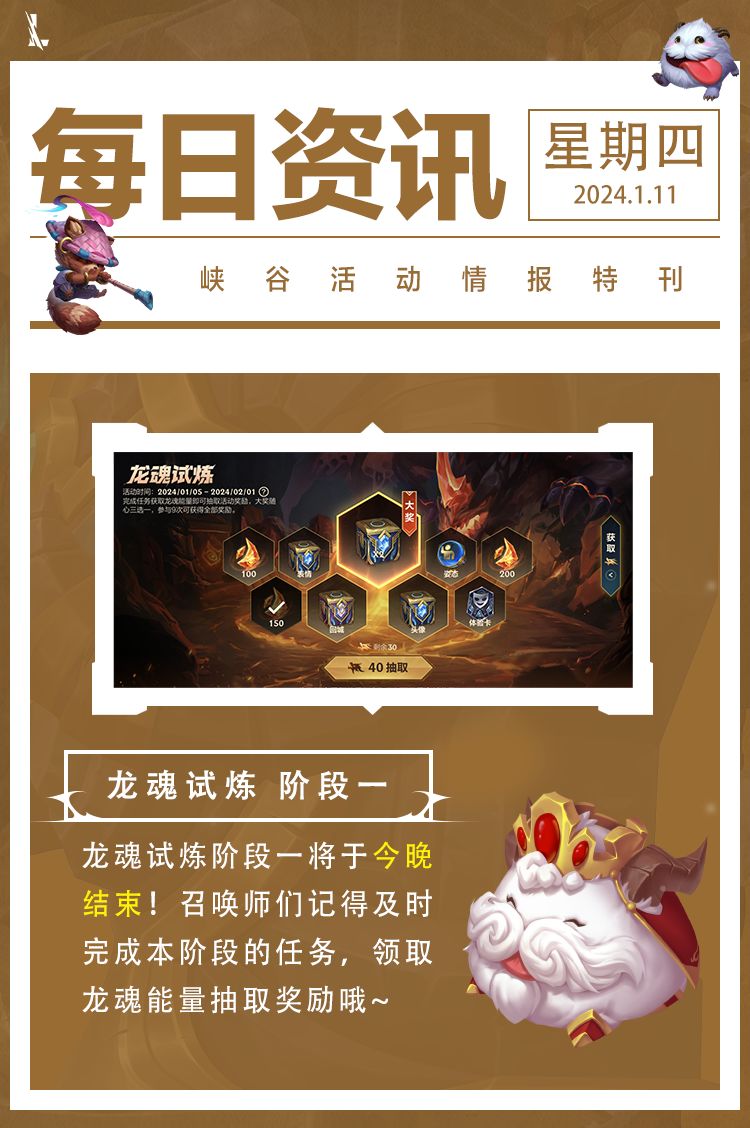 新版前瞻 分享有礼今日起,截止至1月17日23:59,每天都将解锁一张新版本亮点内容倒计时海报。召唤师们前往游戏活动页面,参与新版本倒计时分享大图活动,完成每日首次分享任务即可获得龙魂水晶好礼。