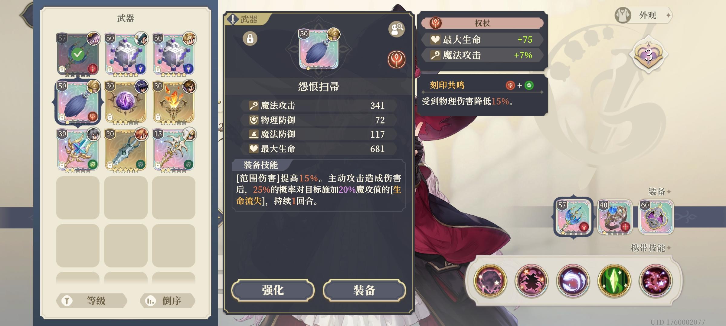推荐武推荐武器怨念扫帚、聚焦法杖。二选其一。他的生命值并不高。并且法强已经很高了,所以还是功能性为主