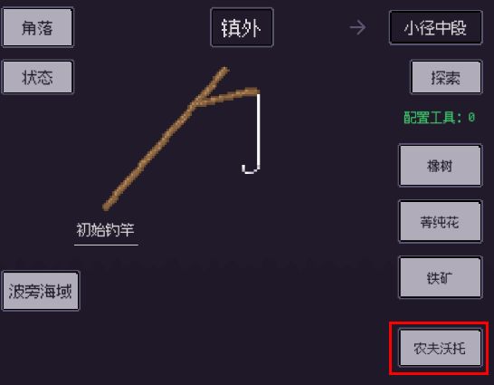 接完任务后点击《塞斯外道》点击《小径中段》(此为小地图地点切换方式,小地图切换不消耗SAN值),然后与 NPC:农夫沃托 对话接任务,收集300个枯树枝(该任务为钓竿:茅草竿任务环 附茅草竿属性)