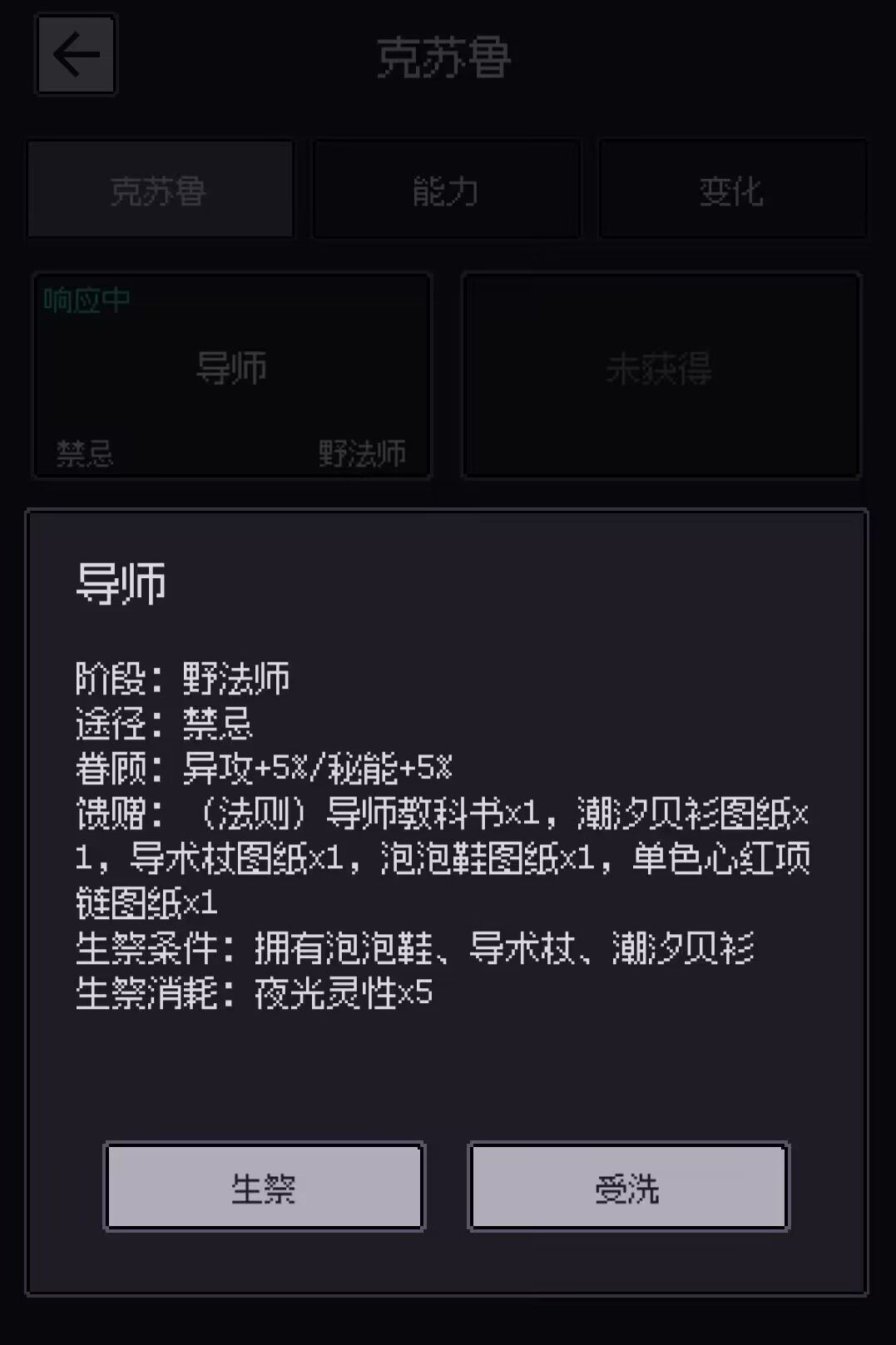 克苏鲁中的法师职业,在教堂内部的NPC主教处获得,消耗5夜色灵性生祭(升级),受洗即为取消使用