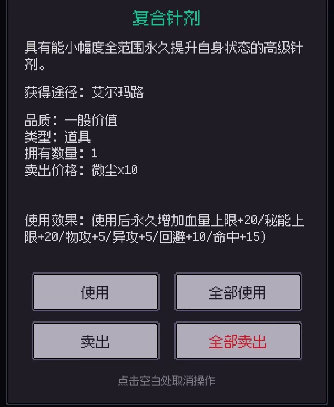 《五色花》任务奖励,在获得所有花后在艾尔玛路对话选择 工艺材料选项后获得,复合针剂永久提升属性
