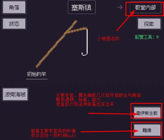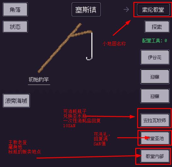 合成钓竿完毕后如果锈贝还有剩余就去《索伦教堂》小地图,点击《教堂内部》与 NPC:霍伊斯主教 对话选择慷慨,多捐几次锈贝后(总计 30+40+50+80锈贝)开放第一个法师职业《导师》,可在 克苏鲁 选项中点响应使用,后期钓鱼出 收集夜光事件 后可消耗 NPC:霍伊斯主教 处购买的 秘瓶 道具获得 夜色灵性,5个夜光灵性升级职业(战士职业也是5个),职业还会给予装备图纸与能力别忘了看看,主教除了 秘瓶 重点需要(升职业需要,做700+耐久的异骼杆 也需要)外还有两项能力 聚能屏障(战斗中技能护盾)和呤诵(战斗中回复秘能,装备后可与教堂内部 的雕像 互动给正面buff)还有遗物 命之护符 记得买(1个就行,在 背包 装配遗物),教堂外的 NPC:安瓦拉牧师 可消耗道具 瓶子 和20 塞斯镇贡献 获得道具圣水瓶(一次性道具,回复10san,瓶子 在《第二民居》的《杂货铺》购买),在《教堂圣池》选《洗礼》可回复满san值。NPC:霍伊斯主教售卖的秘瓶可在钓鱼事件中的《黑色粘液》与《收集夜光》中消耗获得《黑色粘液》与《夜光灵性》,5个《黑色粘液》可在钓鱼事件的《开启岩石纹路》消耗获得 钓竿:异骼竿(700耐久钓竿,附带能力),夜光灵性 效果上述已讲,在克苏鲁 中点击相应职业选择《生祭》即可消耗5个该道具升级职业(还需要拥有该职业的装备)。NPC:霍伊斯主教 还售卖部分法师属性装备。