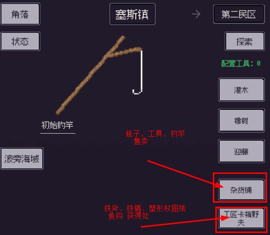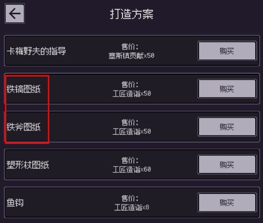 工匠兑换商店,铁斧、铁镐为采集工具,鱼钩为钓竿制作材料