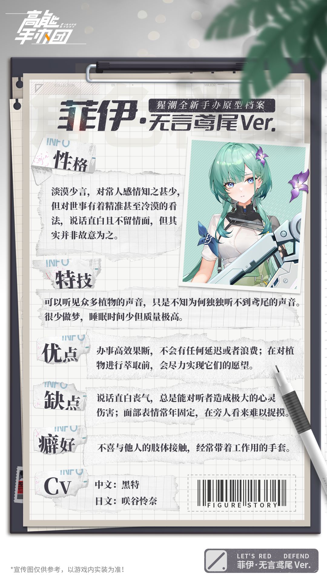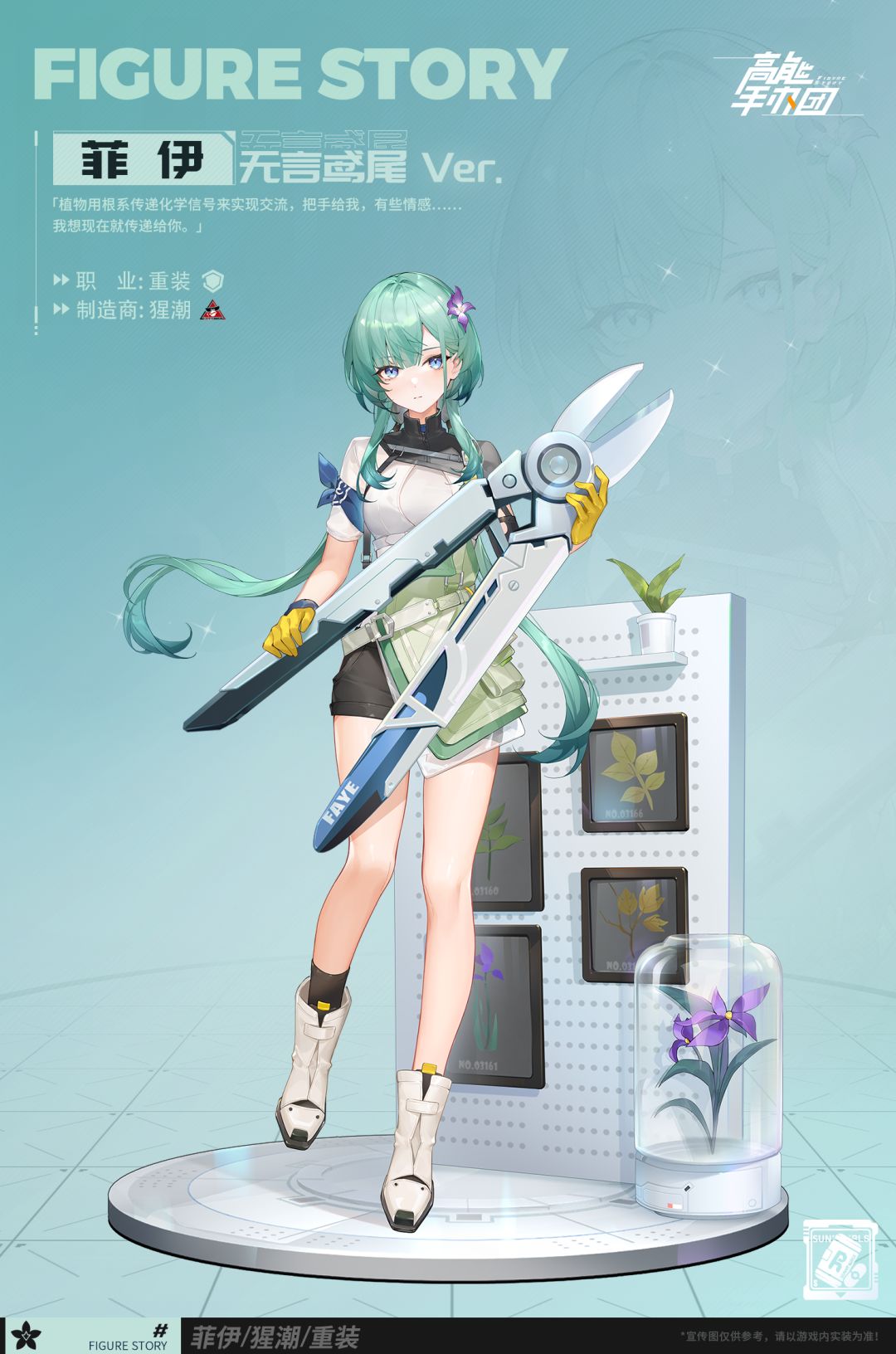 本次新登场的“菲伊·无言鸢尾Ver.”是位淡漠少言,对常人感情知之甚少的少女,可是她尊重万物生命,能听见众多植物的声音,切身明白生命的重量,所以在对植物进行萃取前,会尽力实现它们的愿望。