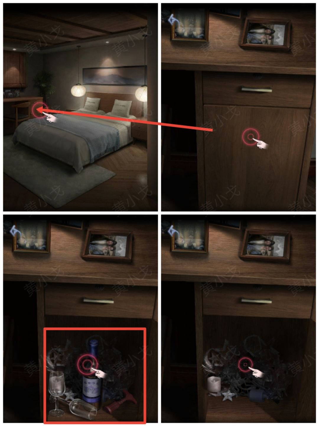 1.(民宿-房间)点击打开桌子下方的柜子,获得【红酒杯】、【红酒】、【开瓶器】和【彩灯】