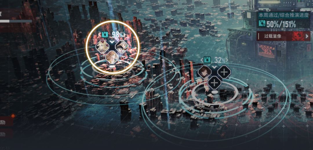 而中心区的决战的可选进度上限是受到大区解锁限制的的,大区全部解锁后,可选进度上限只会受综合推演进度的限制。综合推演进度的规则是每个驻守中的子区域自带5%进度,上面的刻印评分让其每1000分可以提升5%进度。具体是如何计算呢?譬如你攻克了3个子区域,就能获得15%通过度,而刻印总分一共7000点的话,那么就能转化为7×5%也就是35%通过度,两者相加一共有50%熟练度。此时过载呈象对应的BOSS也就是50%难度级别的BOSS。