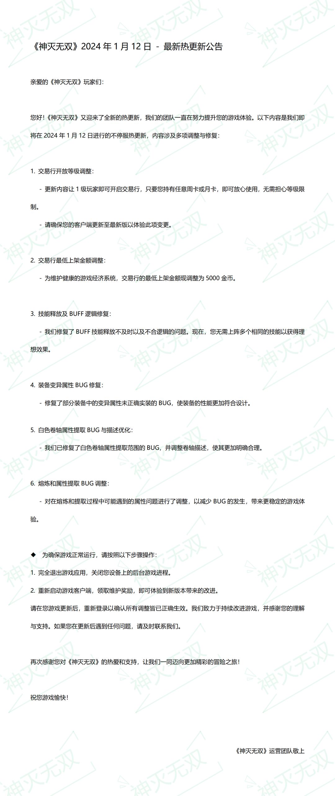 《神灭无双》2024年1月12日不停服更新公告