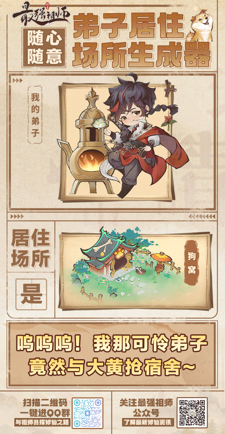 今天活动参与方式非常简单,在《最强祖师》中住所分为洞府、房舍、仙居、仙栈和狗窝。趁公测来临之际祖师们不妨提前为弟子分配一下居住场所~