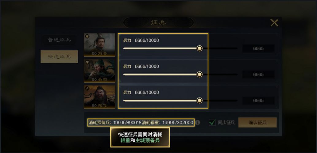 而征兵所消耗的辎重和预备兵的比例是1:1,消耗多少辎重,就会消耗多少预备兵。所以这里难受哥也要提醒各位一下,除了注意辎重是否充足外,也要看预备兵是否充足,可不要到时候发现预备兵不够不能征兵。
