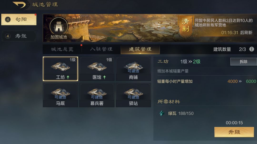 无需繁琐操作,同盟内的所有同盟城池都会自动生产辎重,每小时的产量取决于城池内的“工坊”的等级。所以想要辎重生产效率高,要么多攻占几座城池,要么升级城池内的工坊。