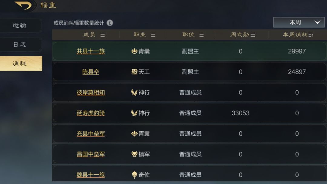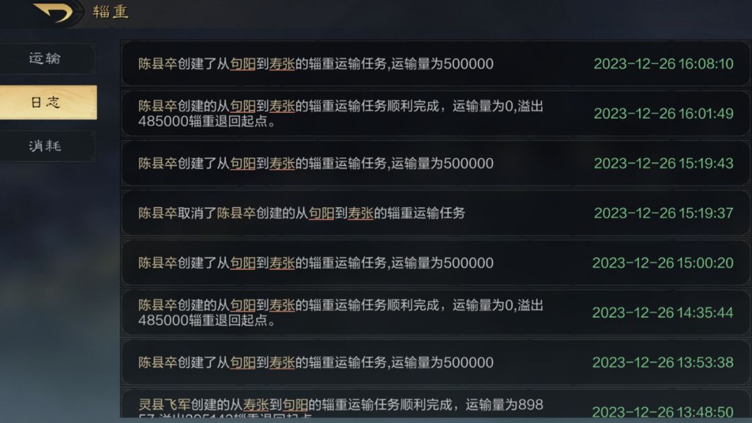 4.辎重页面可以看到辎重运输日志和消耗,谁创建了运输任务,谁消耗的辎重补充兵力一目了然。盟主要盯紧同盟里谁在乱打架消耗辎重不干活。