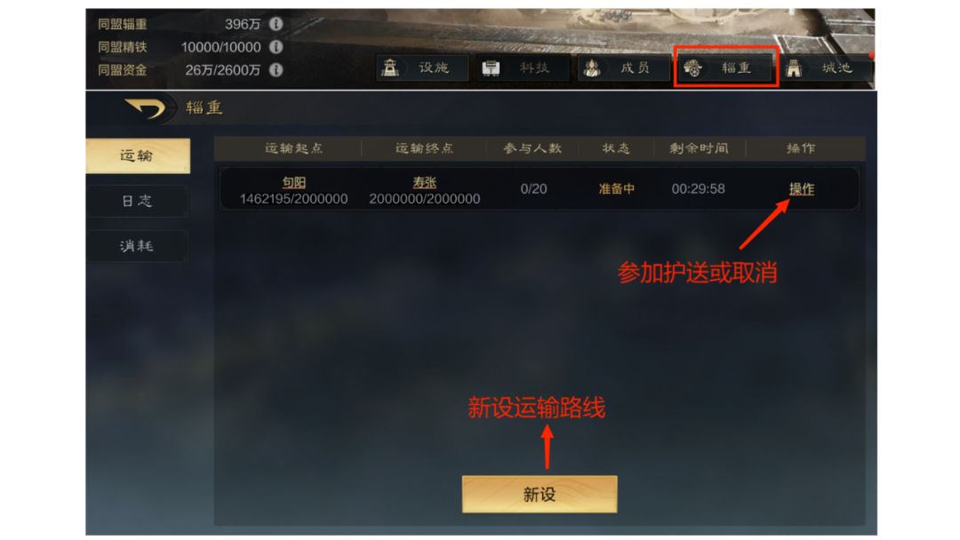 在辎重运输前的30分钟准备时间里,同盟内所有人可以在辎重页面看到准备中的辎重运输路线。同盟成员可以派遣部队护送运输部队,一条路线只能有一个人参加,最多可参与20个人,护送部队会跟随运输部队到达目的地。