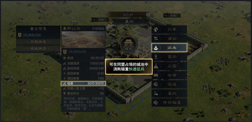 首先我们来看看同盟城池内快速征兵。将军队调动至同盟城池中,然后指令中选择征兵,即可消耗辎重和主城预备兵进行快速征兵。不需要消耗时间,可以飞速补兵然后重新投入战场,这对战况瞬息变化的战场来讲十分的有帮助。