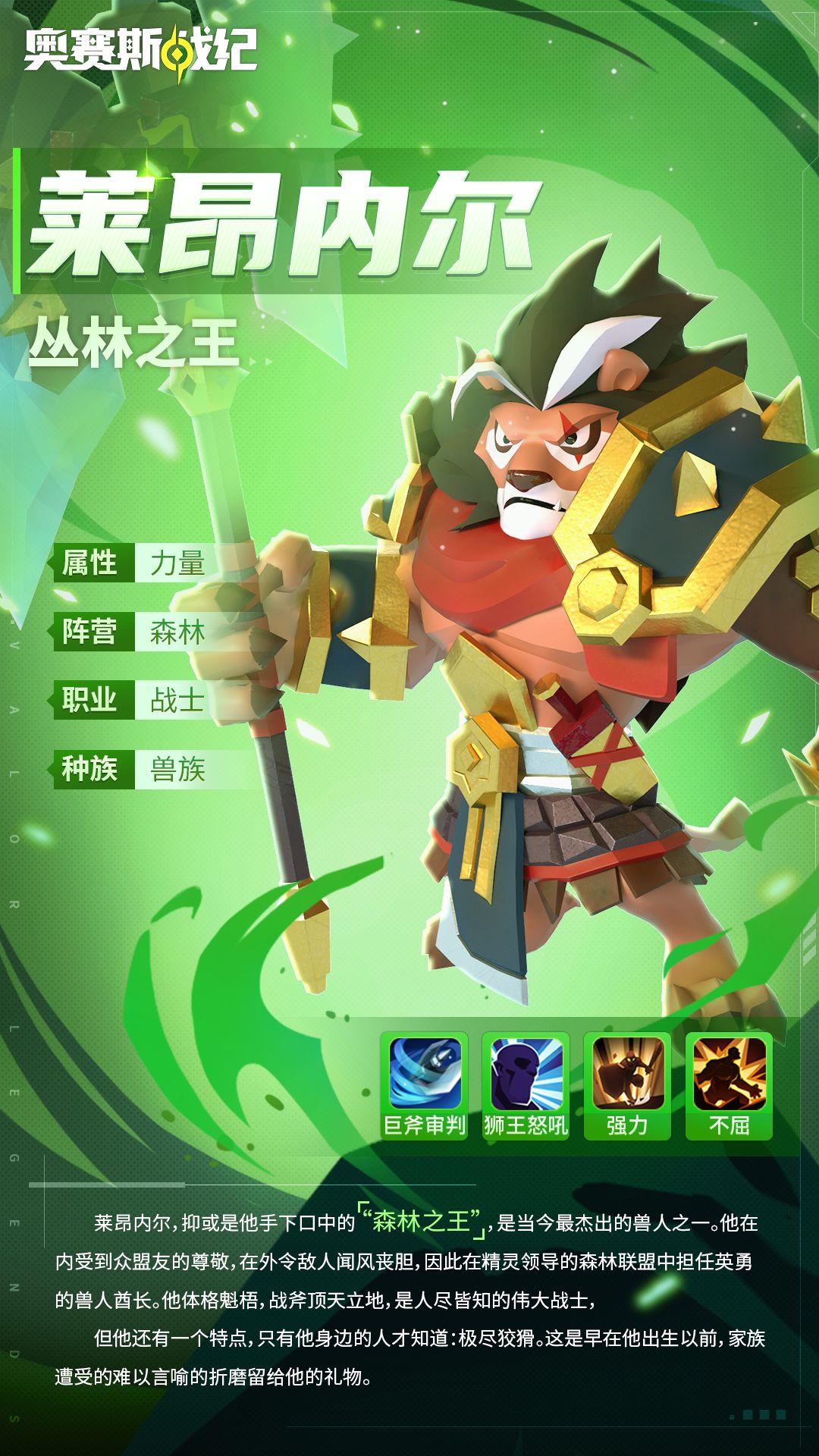 莱昂内尔,抑或是他手下口中的“森林之王”,是当今最杰出的领袖之一,在精灵领导的森林联盟中担任英勇的兽人酋长。他体格魁梧,战斧顶天立地,是人尽皆知的伟大战士,但他却有着与粗犷外表截然不同的缜密心思,极尽狡猾。