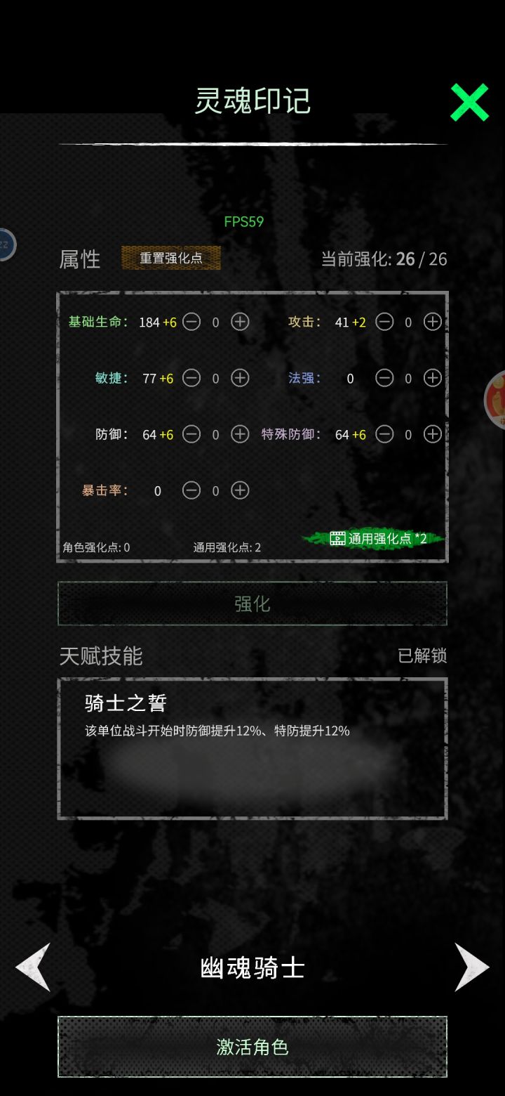 游戏有个小bug -不过我也不清楚是不是作者留的后门 ,属性强化 ,点第一次强化为五 第二次强化为15魂屑 ,强化得时候不要连续点强化 ,就是不要超过5魂屑 。举列:强化一次之后点重置强化点(现有属性点1), 再次强化原有属性点在花5魂屑得到第二个强化点,再次重置 ,以此重复 ,一个角色26×5 不超过130 ,有450就可以开一个角色然后强化满。