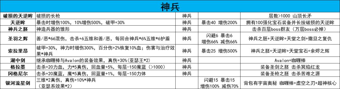 通常圣羽/索拉+1神兵,湖中剑+1,格拉墨+1,冈格尼尔+1,神兵之胚+1(万层后)