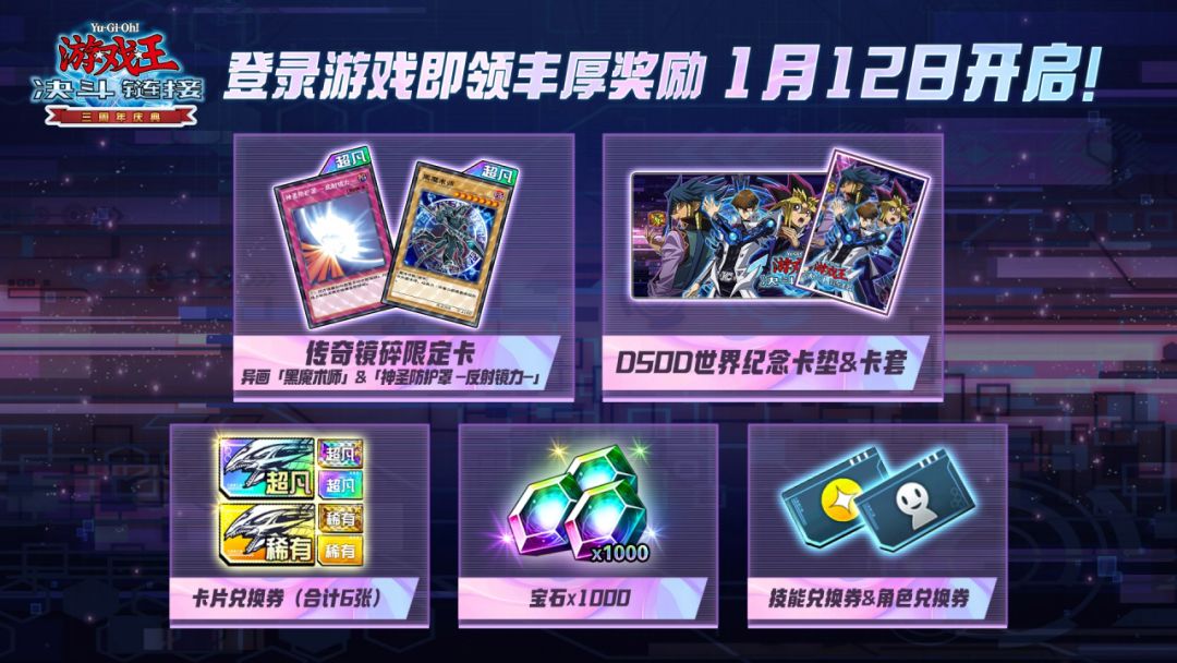 三周年登录活动届时同步开启,包含超凡&稀有梦想卡片兑换券、超凡&稀有镜碎卡片兑换券等豪华奖励等待着各位决斗者!
