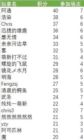 各位玩家好,非常感谢大家的参与和支持。恭喜以下玩家获得本次比赛的奖品,他们的积分分别为:【阿通】 40分、【浩染】 38分、【Chris】 37分、【迅捷的雄鹿】 36分、【墨无情】 34分、【亲亲河边草】 33分、【畧】 32分、【萌新打不过】 31分、【螺旋的飞鼠】 29分、【镜花乄水月】 28分、【明海】 28分、【Fengzsj】 27分、【清晨的鳄鱼】 25分、【武圣】 24分、【纯纯一萌新】 22分、【chris3】 22分、【然然然然然然】 21分、【yzy】 21分、【阿司匹林】 21分、【魔】 20分