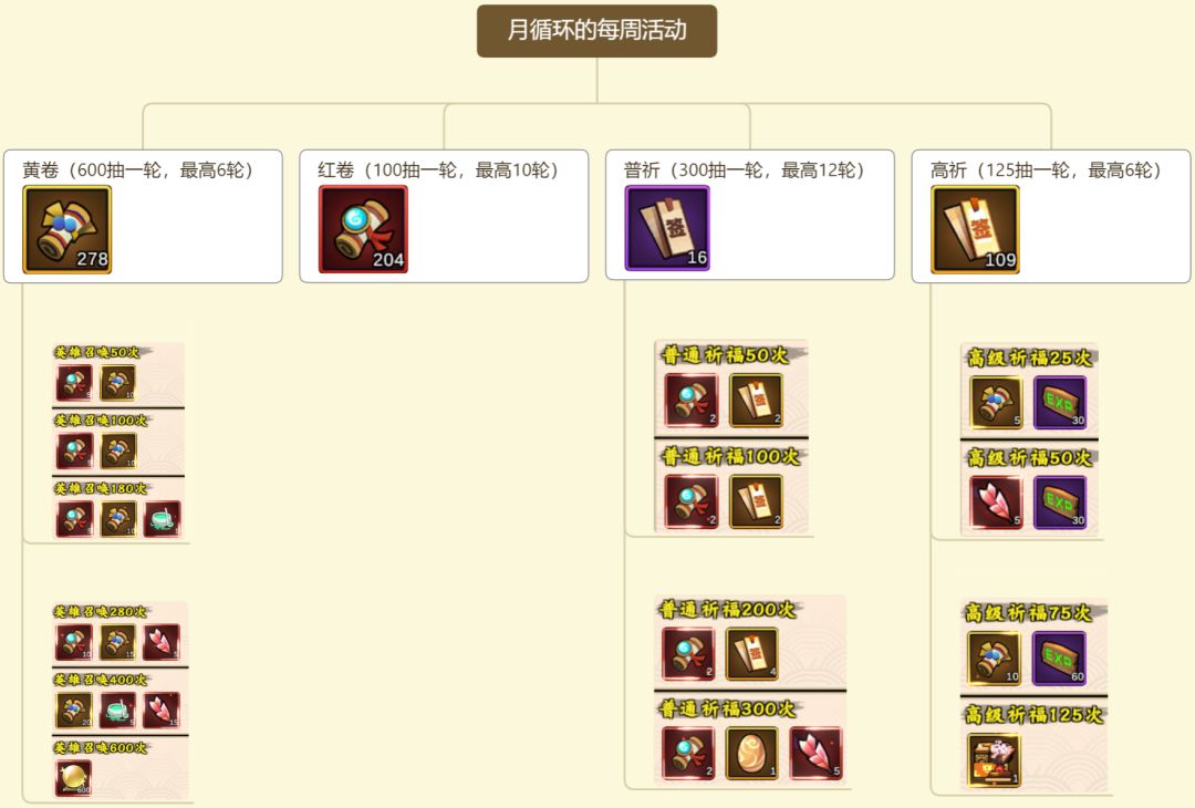 黄卷→红卷→普祈→高祈→黄卷→......循环,每种持续一周。在对应的周消耗对应的道具会有额外活动奖励。