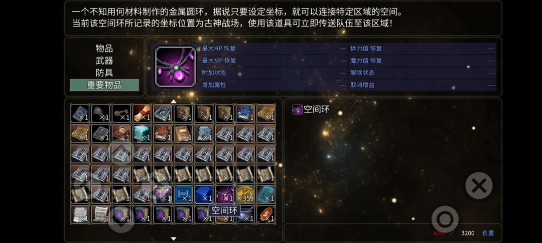 这个一般都拿得到,是在做“天外来客”支线中毕加索给的,但是很容易触发一个bug→该道具是用来进入古神战场的,出去的话得找场景中的传送水晶出去,而有的玩家出去也会用空间环,导致会再也进不了古神战场。