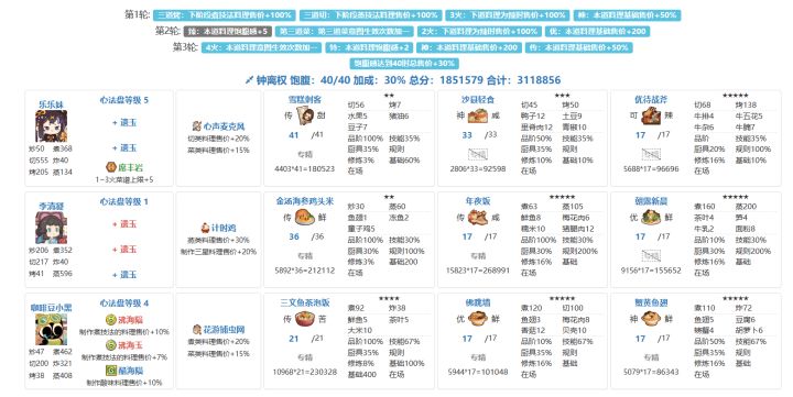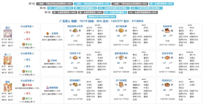 风云宴大号一档311w分,超过一档线26w,遗玉都基本上是高配了,席丰玉加上限依然是最强遗玉,厨师和三火厨具都固定了,以后不怎么会变化;