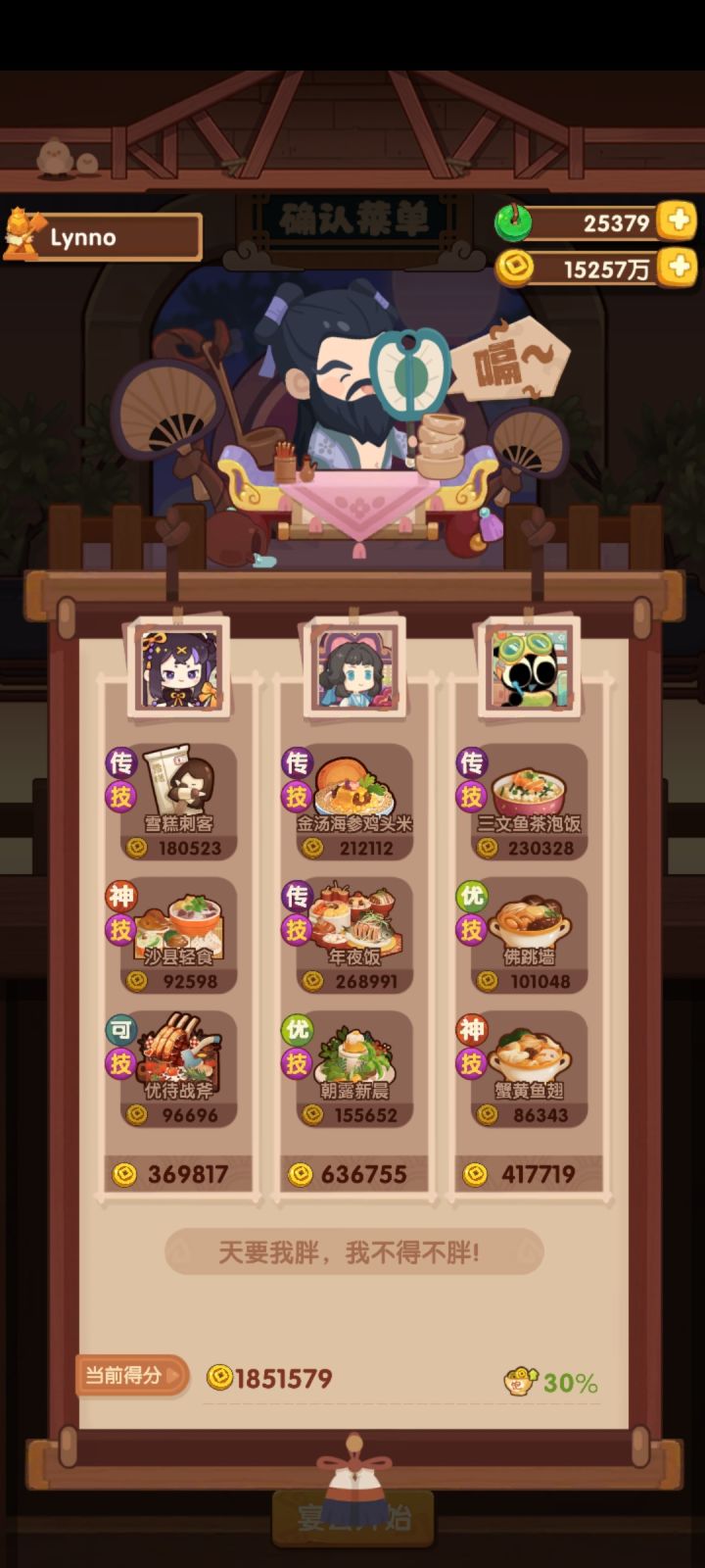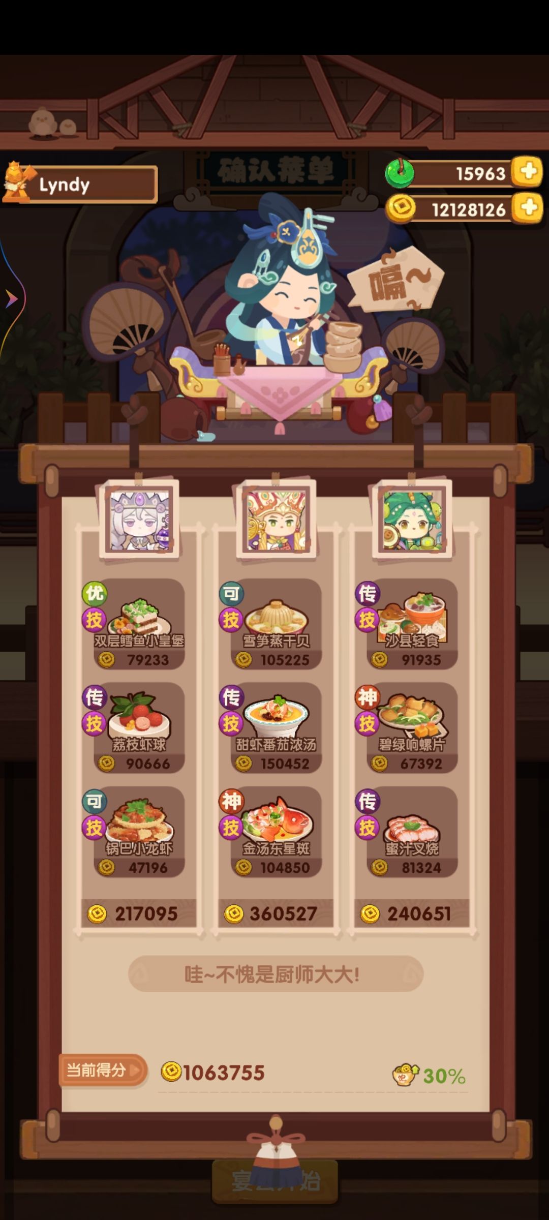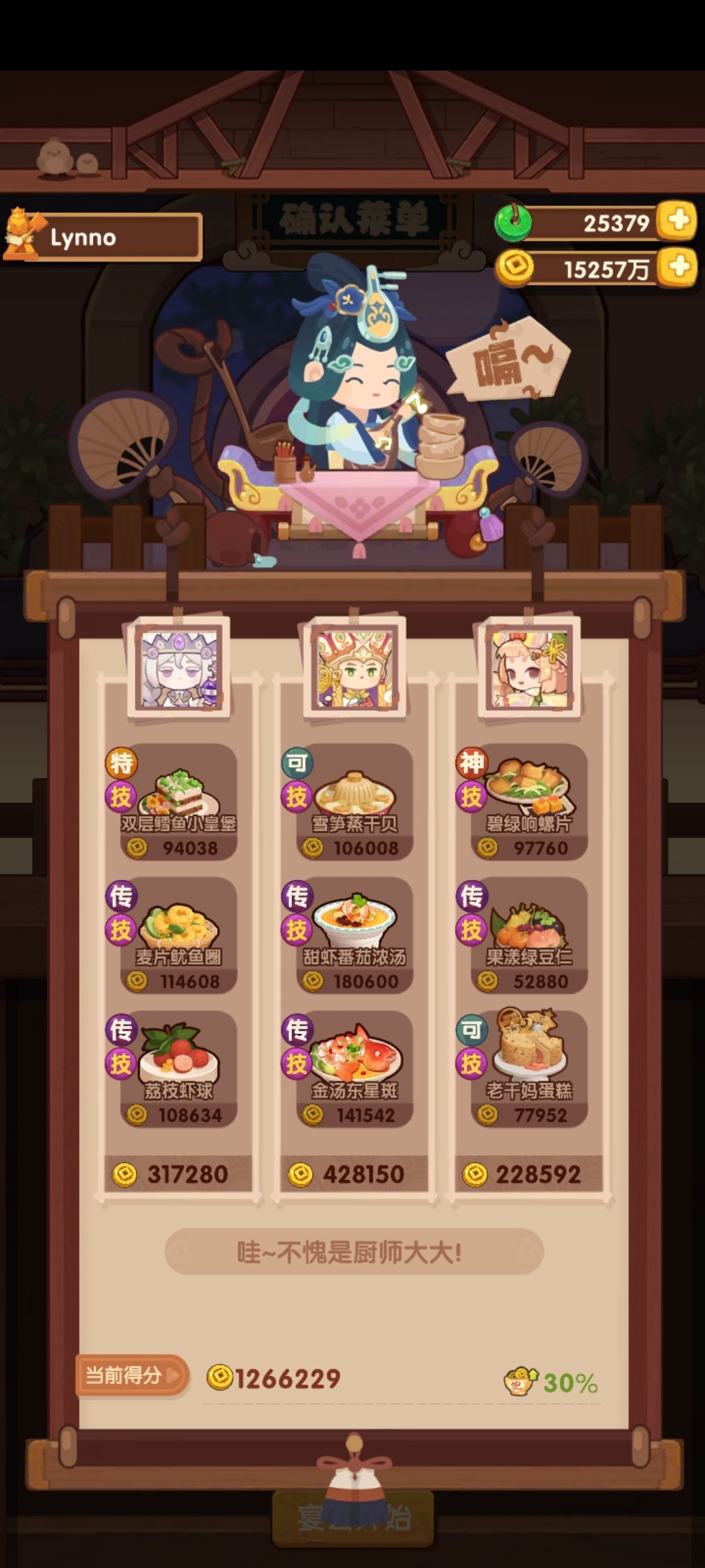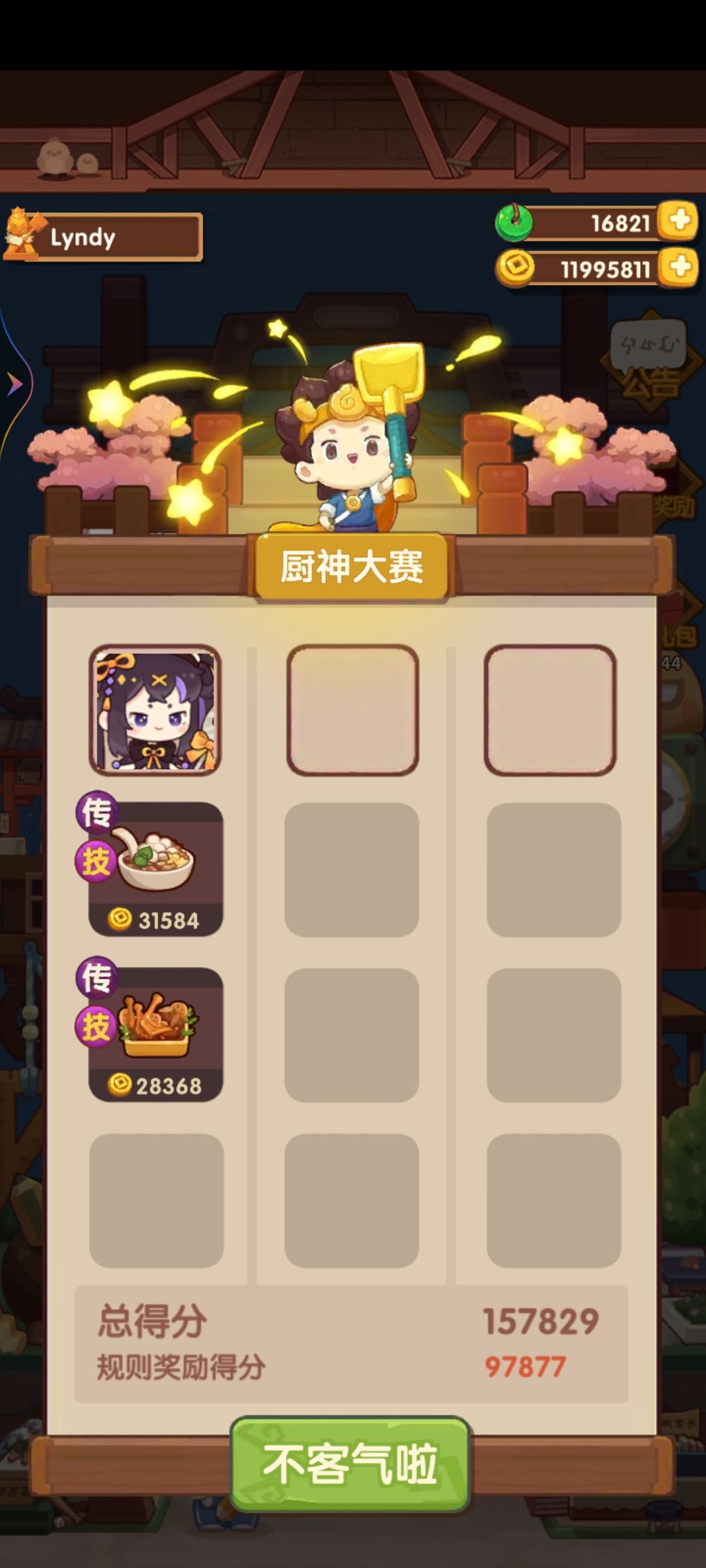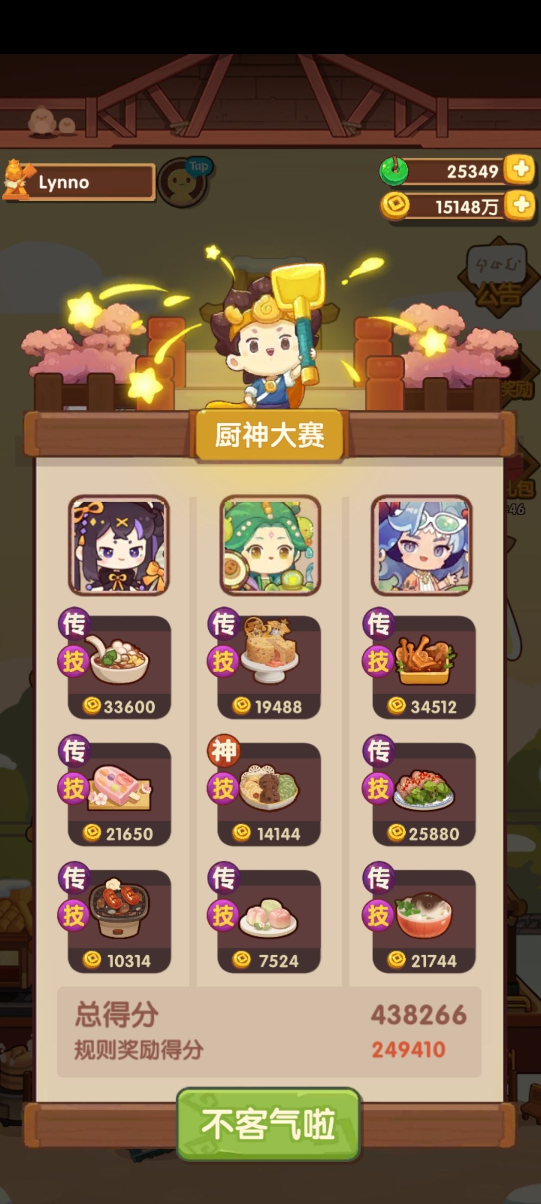 厨神很容易,大号看看最高是43w,小号以后只上越线的菜就好了,小号上了两个菜就过了15w。