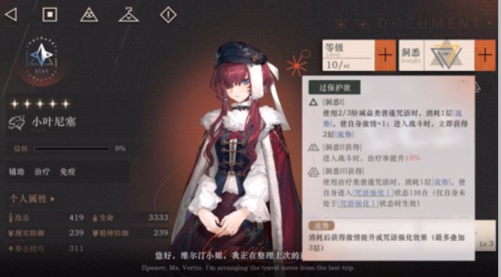 一个比较简单高效的单体回复技,额外赋予的坚固保护我方残血角色不会暴毙。大招湍流知晓一切我方全体获得小印尼赛最大生命25%的护盾两回合并进入免疫一回合,额外赋予自身两层流势。如之前前瞻视频演示面对可提前预知的大招或debuff能成为很好的对策技能,持续两回合的护盾也是不错的增益,流势是小叶尼赛专属的强化特效主要体现在它的洞悉。 洞悉 过保护欲洞二进入战斗治疗率升10%和群奶目前都是10%洞二的治疗率提升相同,区别是四塑可以提升治疗率至18%而且是根据最大生命进行的回复,除气球派对外目前的奶妈都是根据攻击进行回复的,全由生命排行第八的小叶尼赛 奶量可说是非常可观。洞一使用二三阶debuff时消耗一残流势,自身激情加一进入战斗时获得两层流势,洞三使用health时消耗流势使自身进入咒语强化1一回合仅未触发咒语强化时可生效。 所以循环的构件就这么起来了,洞三的优先级极高使用一星的health消耗一层流逝势获得咒语强化,使一星的attack变成debelf, debelf使用后消耗一层流势获得额外激情加一充能,开大再次获得两层流势继续循环,什么时候充能什么时候咒语强化决定你能否用好小叶尼赛,用得好两回合一个大也是很容易的,可能你的盾刚削新盾就又来了。