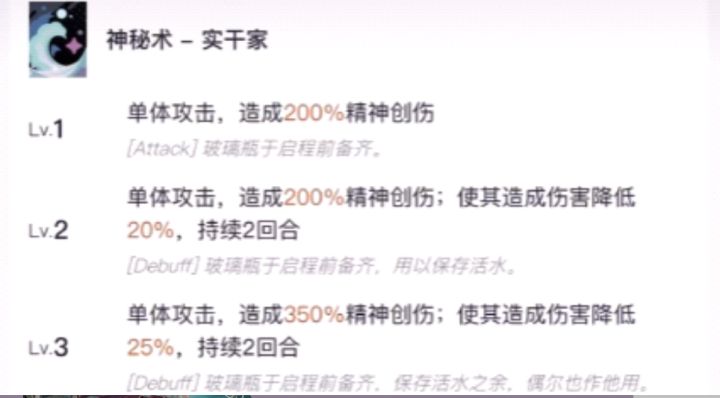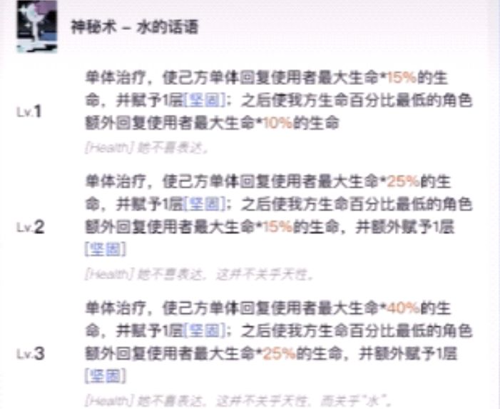 一阶attack二三阶debuff,面对单体精英、boss时是有着非常有效的伤害限制手段。二技能水的话语,使我方单体回复小叶尼赛一定比例最大生命并赋予坚固,之后使生命百分比最低的我方单体再进行一次回复。二三阶时额外赋予生命最低的我方单体一层坚固具体倍率如图
