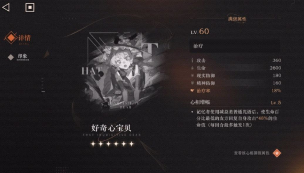 好奇心宝贝 第五次条治疗率使用debuff咒语后使生命最低的我方单体回复自身攻击一定比例的生命值,最通用的治疗心相估计90%的玩家都有。