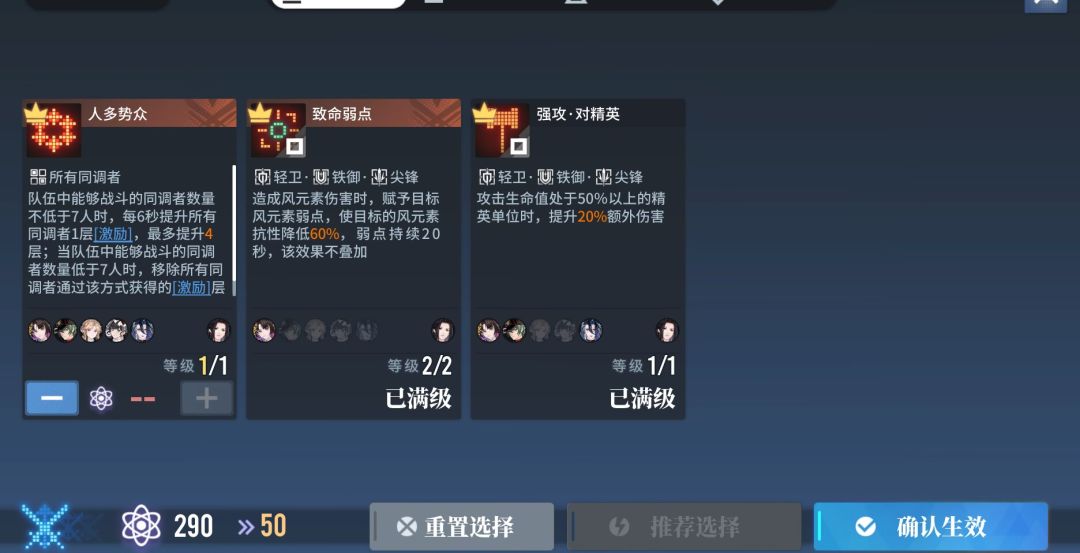 最后战斗时的准备阶段可以查看你的蚀刻当前拥有,且能触发的激励情况。比如我的队伍只上了5个角色,就没法触发人多势众……。