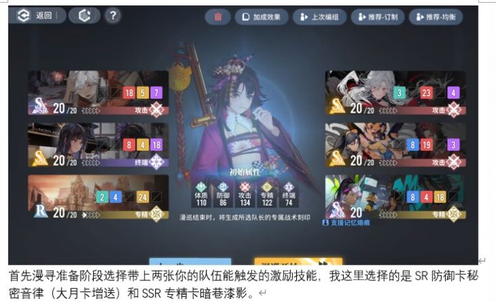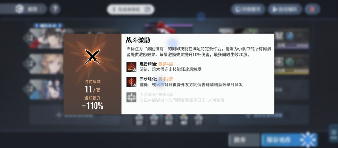 另外部分角色的队长技也可以叠激励。比如图七同步强化就是四星角色狄砚的队长技。前期缺少激励烙痕,叠不满20层,可以让这些角色当队长(就是选他刷漫寻)