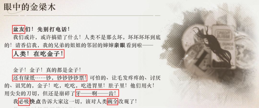 - 用重复性文字“钞,钞钞钞钞票”,破折号“牙——啊——齿!”表现魔精目睹暴雨症候后谵妄的意识状态